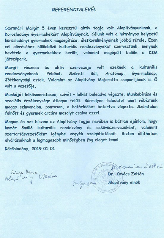 Úgy éreztem a gyakorlati tapasztalataimat, ki kell egészítenem a szakma hivatalos és teljeskörű elméleti és gyakorlati képzésével, hiszen így tudok majd tökéleteset adni Nektek. Mindezt egy hosszú tanulási folyamat során a Prestige Oktatási Stúdióban Budapesten végeztem, kulturális rendezvényszervezőként, ahol neves oktatók és magas színvonalú gyakorlati képzések segítettek a felkészülésben. Ezután szintén ugyanitt az Ország legjobb esküvőszervezőjénél Rátkai Tímeánál, aki a Magyarországi Esküvőszervezők Szövetségének alelnöke, tanulhattam meg az esküvőszervezés elméleti és gyakorlati fortélyait. Mindig hálás leszek neki végtelen kedvességéért és őszinte iránymutatásáért. Végül szertartásvezetőként is itt végeztem, ahol teljeskörű tudást szereztem a házasulandó párok életének legszebb eseményének megtartásáról, a házassági szertartásról.